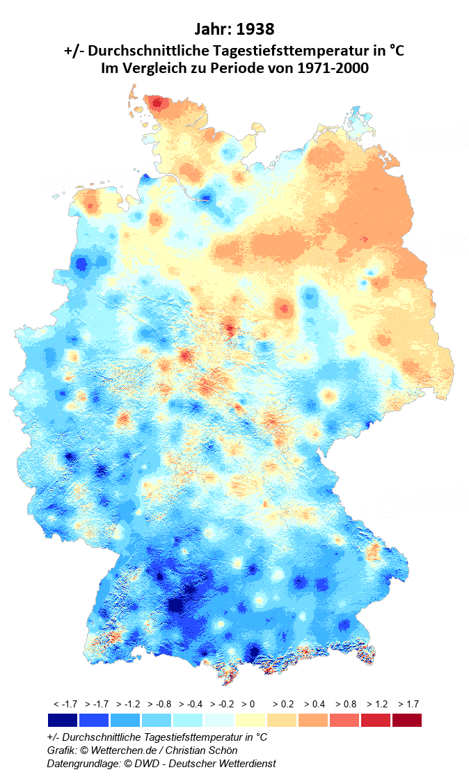 1938 - +/- Durchschnittliche Tagestiefsttemperatur in °C
