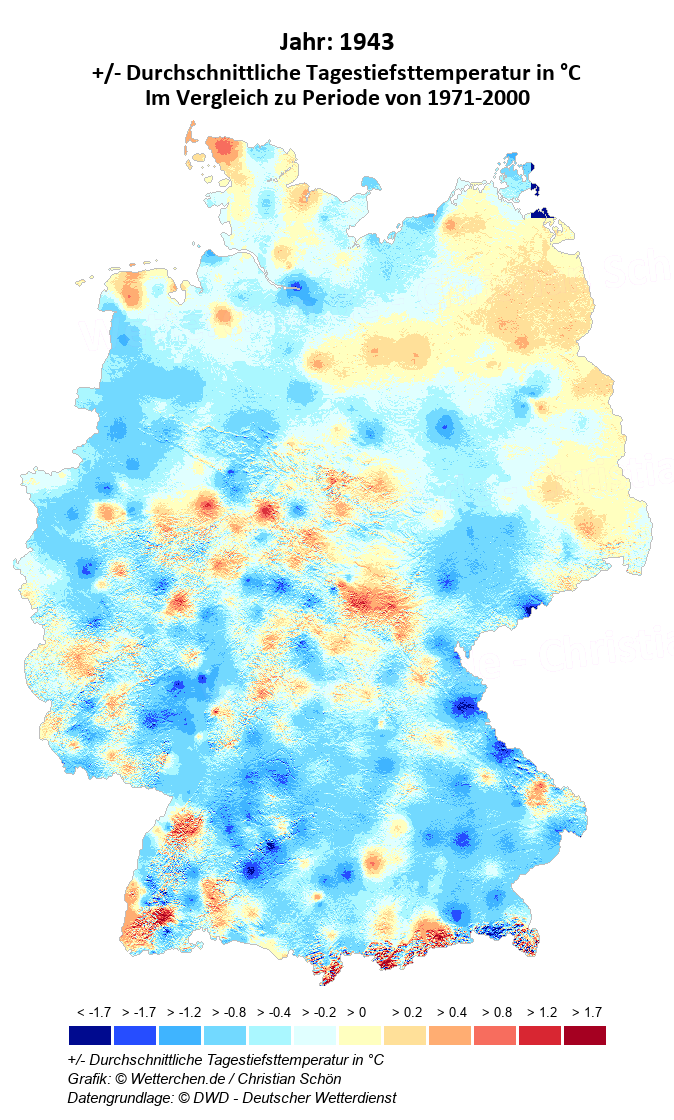 1943 - +/- Durchschnittliche Tagestiefsttemperatur in °C