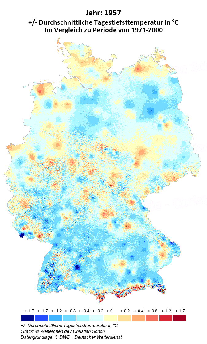 1957 - +/- Durchschnittliche Tagestiefsttemperatur in °C