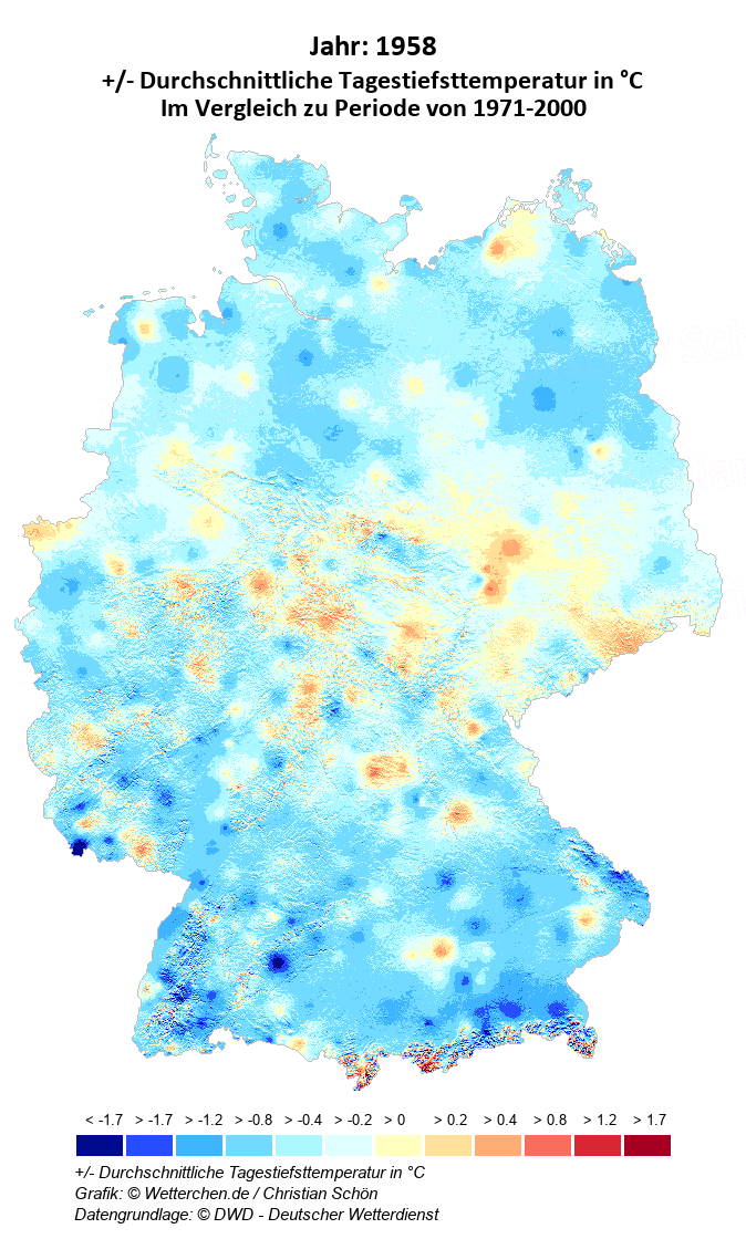 1958 - +/- Durchschnittliche Tagestiefsttemperatur in °C