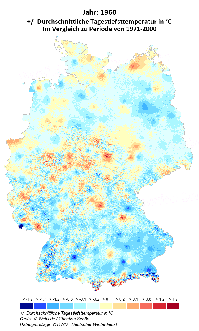1960 - +/- Durchschnittliche Tagestiefsttemperatur in °C