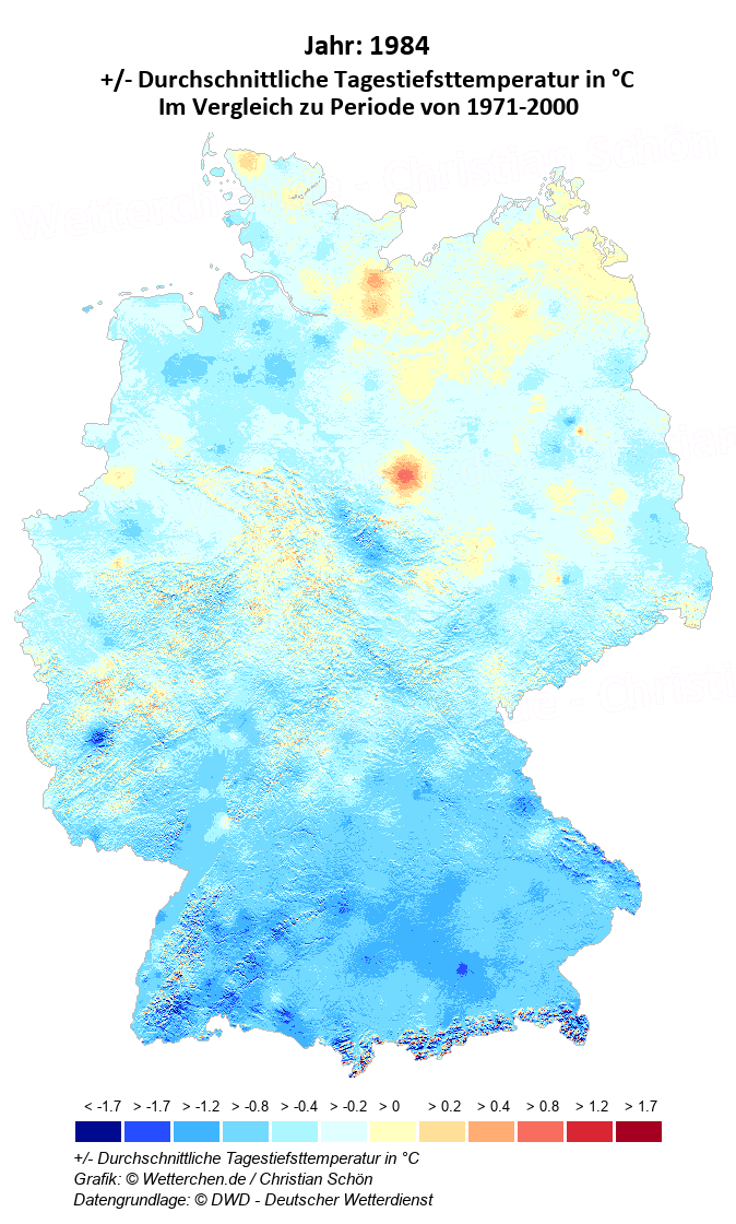 1984 - +/- Durchschnittliche Tagestiefsttemperatur in °C