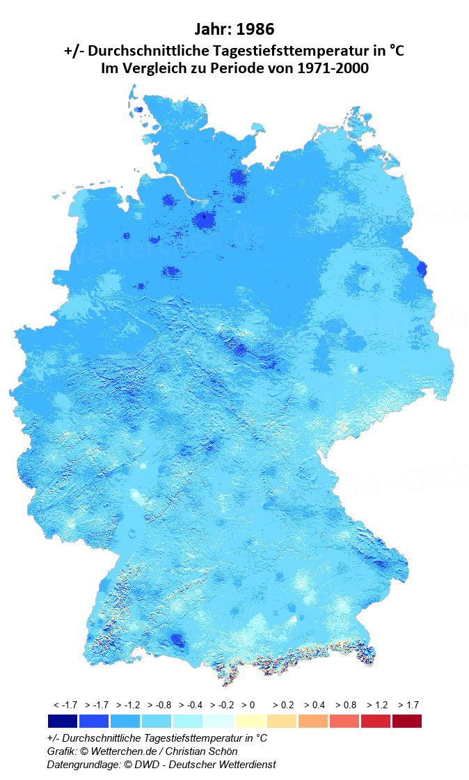 1986 - +/- Durchschnittliche Tagestiefsttemperatur in °C
