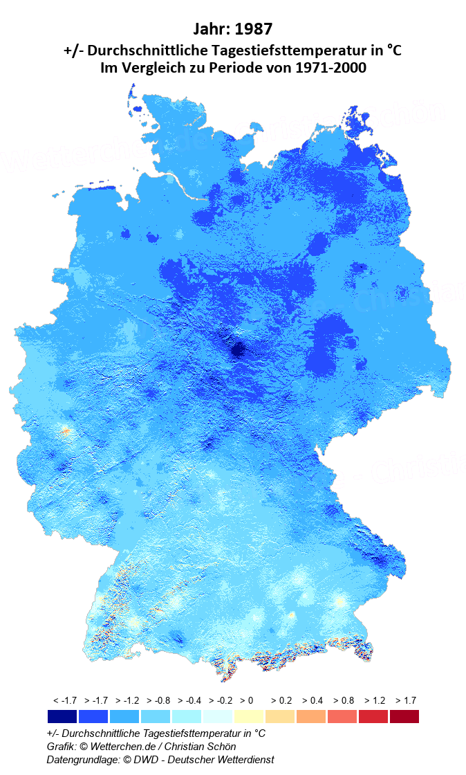 1987 - +/- Durchschnittliche Tagestiefsttemperatur in °C