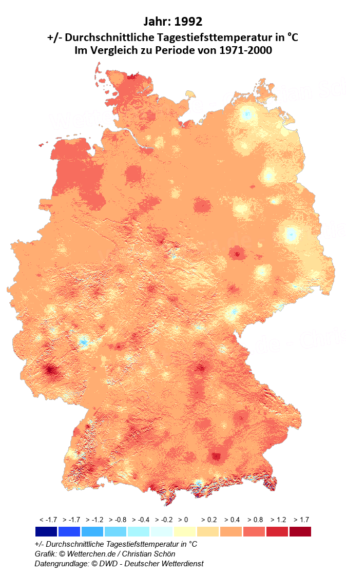 1992 - +/- Durchschnittliche Tagestiefsttemperatur in °C