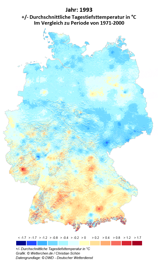 1993 - +/- Durchschnittliche Tagestiefsttemperatur in °C