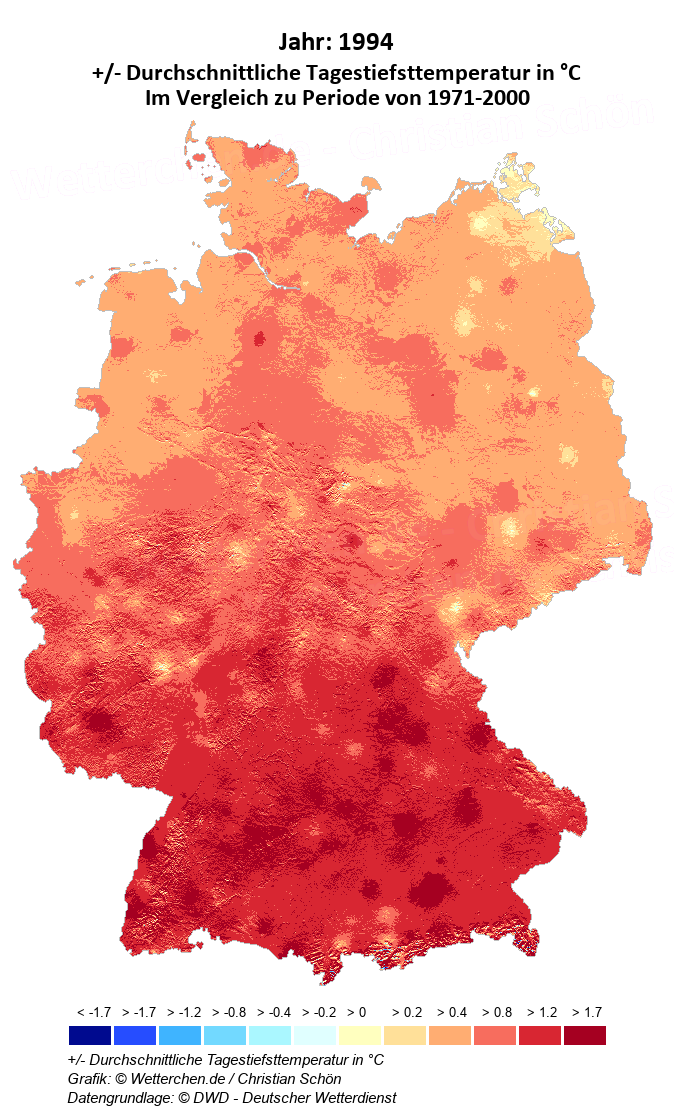 1994 - +/- Durchschnittliche Tagestiefsttemperatur in °C