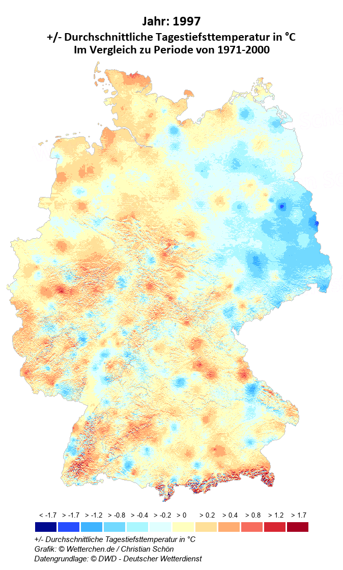 1997 - +/- Durchschnittliche Tagestiefsttemperatur in °C