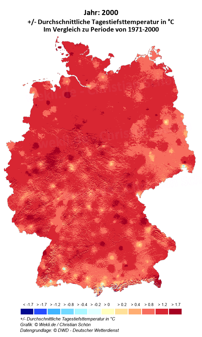 2000 - +/- Durchschnittliche Tagestiefsttemperatur in °C