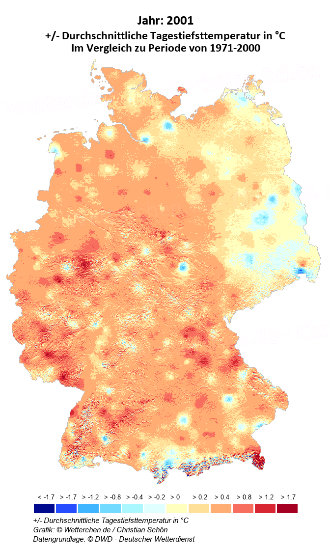 2001 - +/- Durchschnittliche Tagestiefsttemperatur in °C