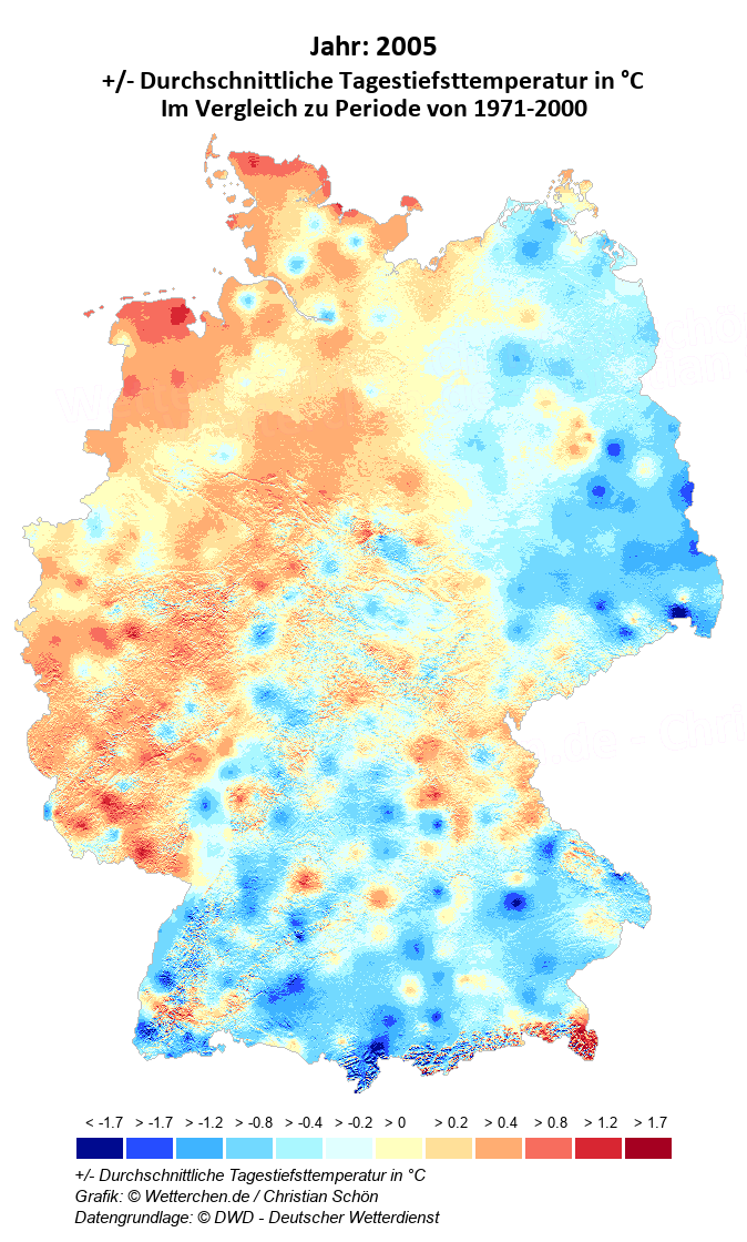 2005 - +/- Durchschnittliche Tagestiefsttemperatur in °C