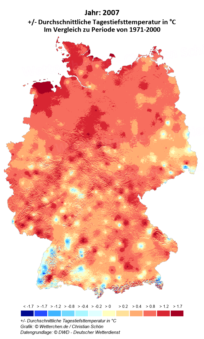 2007 - +/- Durchschnittliche Tagestiefsttemperatur in °C