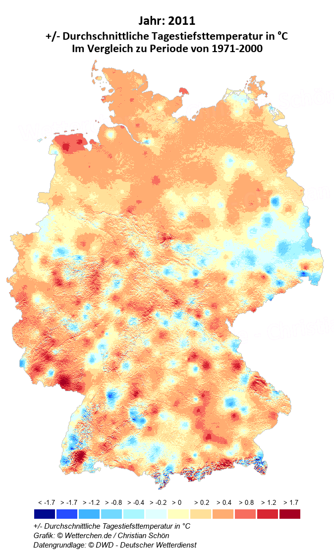 2011 - +/- Durchschnittliche Tagestiefsttemperatur in °C