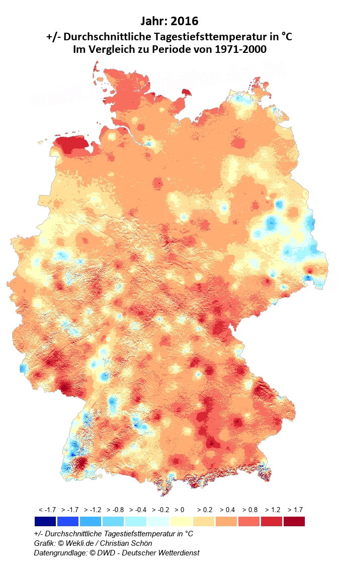 2016 - +/- Durchschnittliche Tagestiefsttemperatur in °C