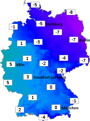 zwischen -1 und +4, am Untermain und im Allgäu bis +7 Grad. Schwacher